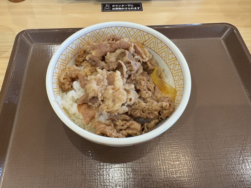 5分以上悩んで一周回って結局戻ってきて注文した基本の牛丼は牛丼チェーンの中でもやさしめの味付けで、お肉も一番柔らかい印象です。